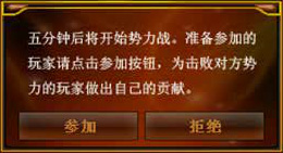 不是点击参加按钮后都可以参加势力战。申请参与势力战后到进入5分钟倒计时,会弹出入场等待窗口。点击参与按钮后进入势力战地图,点击拒绝按钮后会把参与权转给等待参与的玩家。