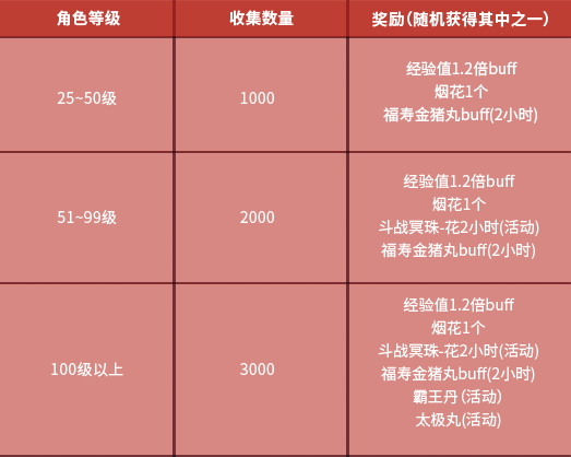 活动奖励:攻击力+15,防御力+15,生命值+150,内功值+150(BUFF持续时间15分钟)。