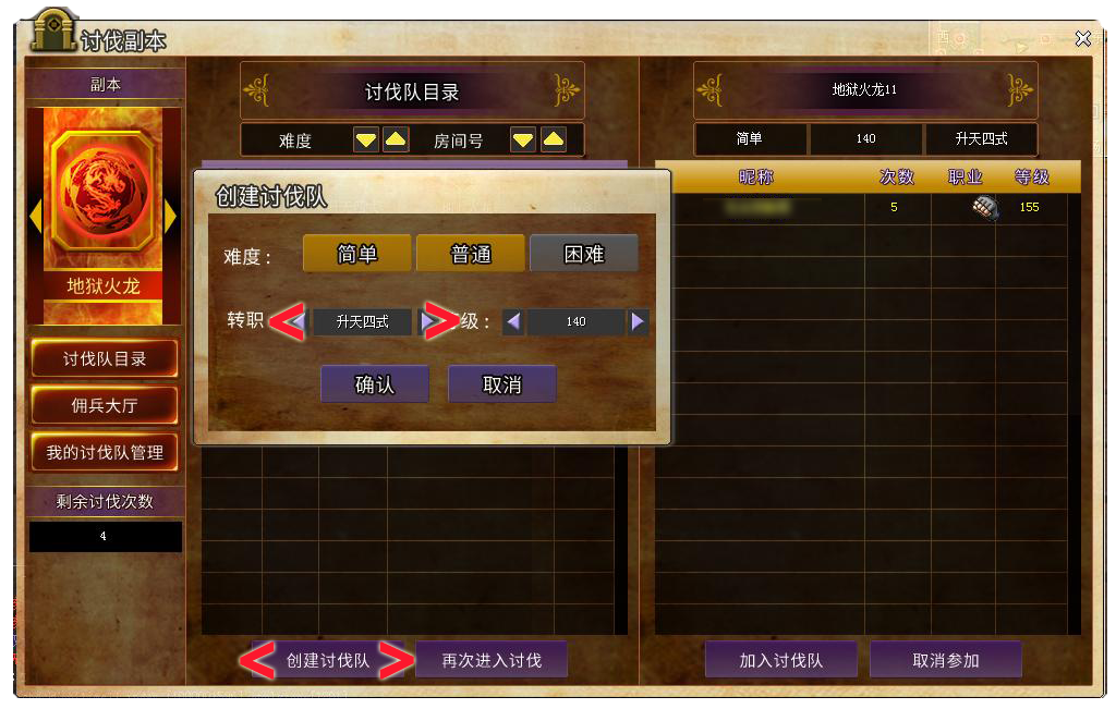 选择难度和转职、等级后点击确认按钮并生成讨伐队。